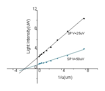 图5计算得到穿透深度()和光强的依赖关系图,利用外推法可到高掺杂单晶硅的扩散长度约在2um
