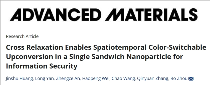 近日,华南理工大学周博教授团队在**期刊Adv. Mater.上分发表了题为“Cross Relaxation Enables Spatiotemporal Color-Switchable Upconversion in a Single Sandwich Nanoparticle for Information Security”的文章。文章报道了一种基于交叉弛豫介导的上转换光色调控策略。设计了NaYF4:Gd@NaYbF4:Tm@NaYF4三明治纳米核壳结构,通过调制Tm3+离子的交叉弛豫过程实现了时空调控的光色可切换发光。调节Tm3+离子掺杂浓度可改变离子间据进而调控交叉弛豫,在980 nm稳态激发时得到Tm3+的蓝色到红色的发光颜色转变。研究同时发现,交叉弛豫与自发辐射存在竞争,而交叉弛豫在时域上比自发辐射稍慢,采用脉冲激光非稳态激发实现了红-蓝发光颜色切换。本文深入探讨了高掺杂纳米系统中离子相互作用的时域特征和物理机制,特别是定义了“特征猝灭时间”用于定量描述交叉弛豫的时域特征。时空调控光色输出在信息安全、多模式防伪和纳米光子学等领域展现出重大应用潜力。