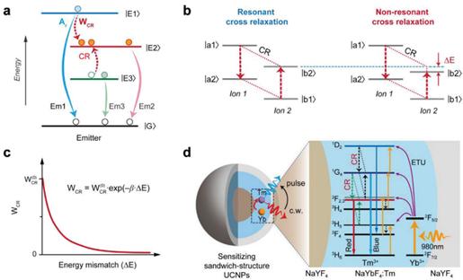 图1. 交叉弛豫介导的上转换发光调控示意图:a)交叉弛豫(WCR)和自发辐射(Ar)的竞争;b)离子之间共振和非共振交叉弛豫;c)交叉弛豫速率(WCR)与能量失配的关系(?E);d) NaYF4:Gd@NaYbF4:Tm@NaYF4三明治纳米结构及激发模式调控实现可调发光。