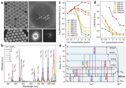 图2. 样品表征和发光性能:a) 样品表征;b)不同Tm3+浓度掺杂样品的发光光谱;c,d)发光强度和寿命变化;e) Tm3+离子之间的部分交叉弛豫过程。