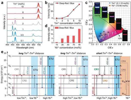 图3. 稳态激发的光色调控:a,b) Tm3+浓度掺杂样品980 nm稳态激发的发射光谱及红-蓝比变化规律;c)不同掺杂浓度样品发光对应的CIE坐标值和发光照片;d) Yb3+浓度掺杂样品的红-蓝比;e)不同掺杂浓度时的发光和交叉弛豫示意图。