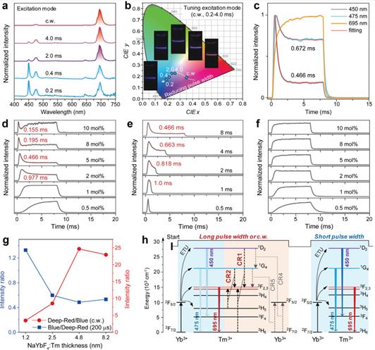 图4. 非稳态激发的光色调控:a,b)不同脉宽980 nm激光激发的发射光谱、对应的CIE坐标以及发光照片;c-f)发射峰的暂态曲线;g)发光层厚度变化样品在稳态激发时的红-蓝比和在非稳态激发时的蓝-红比;h)脉冲调控的可能动力学过程