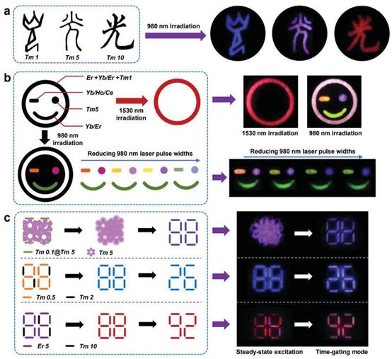 图5. 前沿应用:a)稳态防伪演示;b)脉冲激发的多模式防伪;c)时域信息存储。