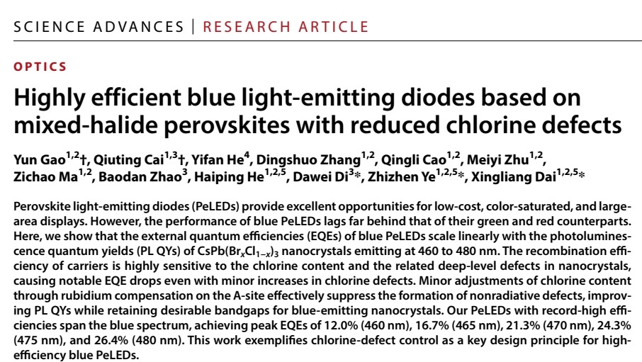 近日,浙江大学材料学院叶志镇院士团队在蓝光发光二极管效率提升方面取得重要进展,研究成果以“Highly efficient blue light-emitting diodes based on mixed-halide perovskites with reduced chlorine defects”为题发表在国际**期刊Science Advances (doi:10.1126/sciadv.ado5645)上。浙江大学为该论文第一单位,高贇博士与蔡秋婷博士为共同第一作者,叶志镇院士、戴兴良研究员、狄大卫教授为共同通讯作者。