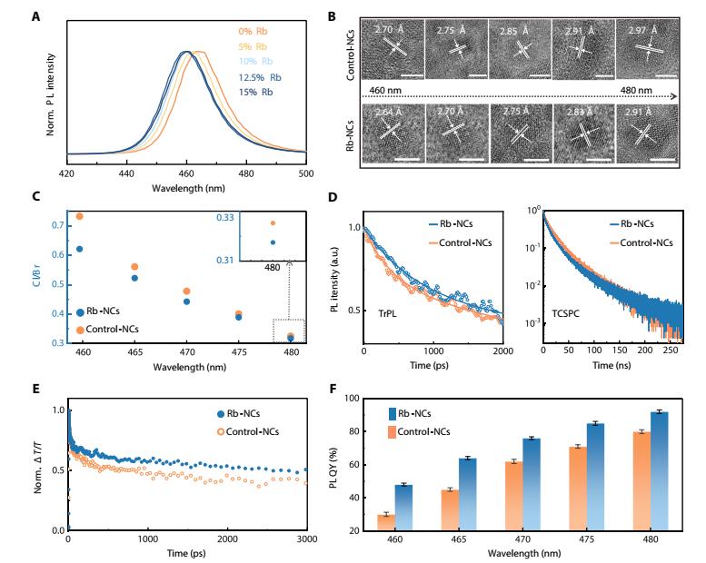 团队以不同时间尺度下的光谱观察了氯含量与氯缺陷及材料光学性能之间的变化与联系,得出氯含量与纳米晶薄膜中缺陷及荧光量子产率呈负相关的定性关系,并提出一条提升蓝光LED器件性能的关键思路,即降低氯含量来抑制氯缺陷。通过A位铷补偿策略,在保证CsPb(BrxCl1-x )3纳米晶发光波长没有偏移的情况下有效降低了氯含量,明显抑制了缺陷,提升纳米晶光学性能。