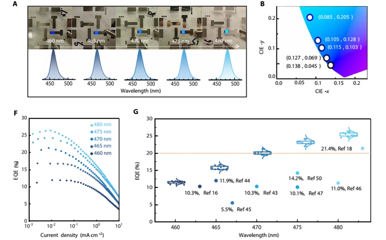 团队基于含铷纳米晶制备的钙钛矿蓝光LED器件在显示需要的波段下均实现了更高的器件效率,特别是480 nm的器件效率达到了26.4%,是截止目前钙钛矿蓝光LED器件中的*高效率。