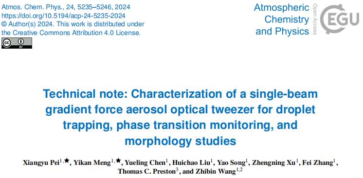 分享一篇来自浙江大学裴祥宇团队的新研究成果,本文以“Technical note: Characterization of a single-beam gradient force aerosol optical tweezer for droplet trapping, phase transition monitoring, and morphology studies”为题发表于期刊Atmospheric Chemistry and Physics,原文链接:https://doi.org/10.5194/acp-24-5235-2024 浙江大学裴祥宇老师为共同第一作者。希望对您的科学研究或工业生产带来一些灵感和启发。