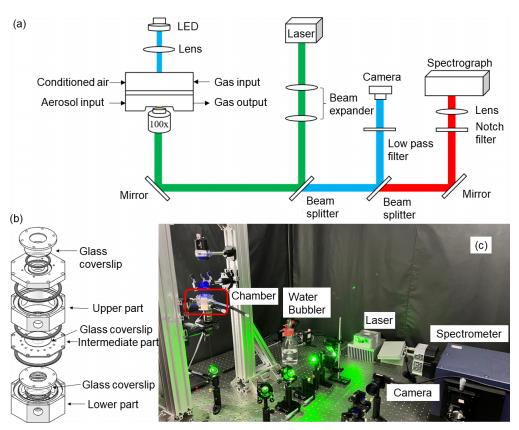 图1.(a) 本研究中使用的气溶胶光学镊装置示意图。(b) 滴液粒子悬浮室的设计。(c) 系统主要部件的照片,包括悬浮室、水汽发生器、激光器、摄像机和快盈lV公司的Omni-λ5004i光谱仪。