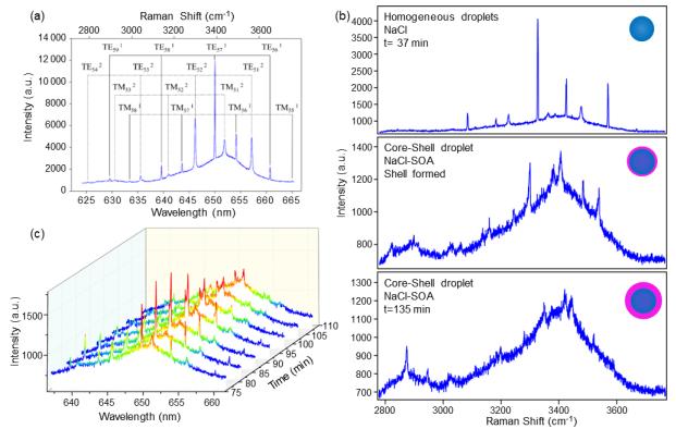 图2. 基于光谱特征识别滴液形态的例子。(a) 捕获的水性NaCl滴的拉曼散射特征图。(b) 不同滴液形态的光谱:上子图显示了均匀水性饱和NaCl滴的典型光谱。中间子图显示了当SOA在饱和NaCl滴表面形成薄壳时的光谱。底部子图显示了当SOA继续在饱和NaCl滴表面凝聚时,WGMs峰值减弱的光谱。(c) WGM分裂时间序列的例子:红色峰值逐渐从一分为二,并且强度变弱,当SOA被加入到滴中时,表明形成了核-壳形态。