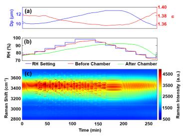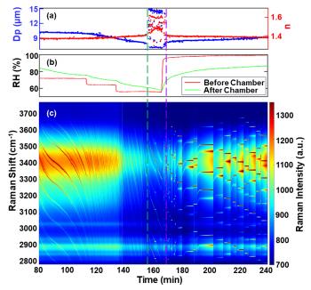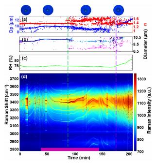图3. (a) 检索到的直径(Dp)和折射率(n)。(b) 测量室内前后的相对湿度(RH)。(c) 捕获的水性NaCl滴液的拉曼光谱时间序列