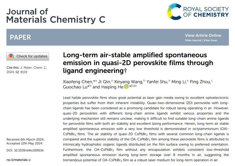近日,浙江大学材料学院何海平教授团队在提升准二维钙钛矿薄膜中放大自发辐射的稳定性方面取得重要进展,研究成果以“Long-term air-stable amplified spontaneous emission in quasi-2D perovskite films through ligand engineering”为题发表在国际知名学术期刊Journal of Materials Chemistry C (DOI: 10.1039/d4tc00915k)上。扬州大学陈小锋教授为第一作者,何海平教授、陈小锋教授和陆国超博士为共同通讯作者。