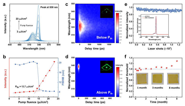 (a) 激发能量密度相关的PL光谱;(b) 发光峰强度、半峰宽与激发能量密度关系图;(c) 和(d)分别为在激发能量密度大于和小于ASE阈值时条纹相机成像图;(e) 2倍阈值能量密度辐照下ASE强度的变化;(f)空气中ASE阈值的长期稳定性实验