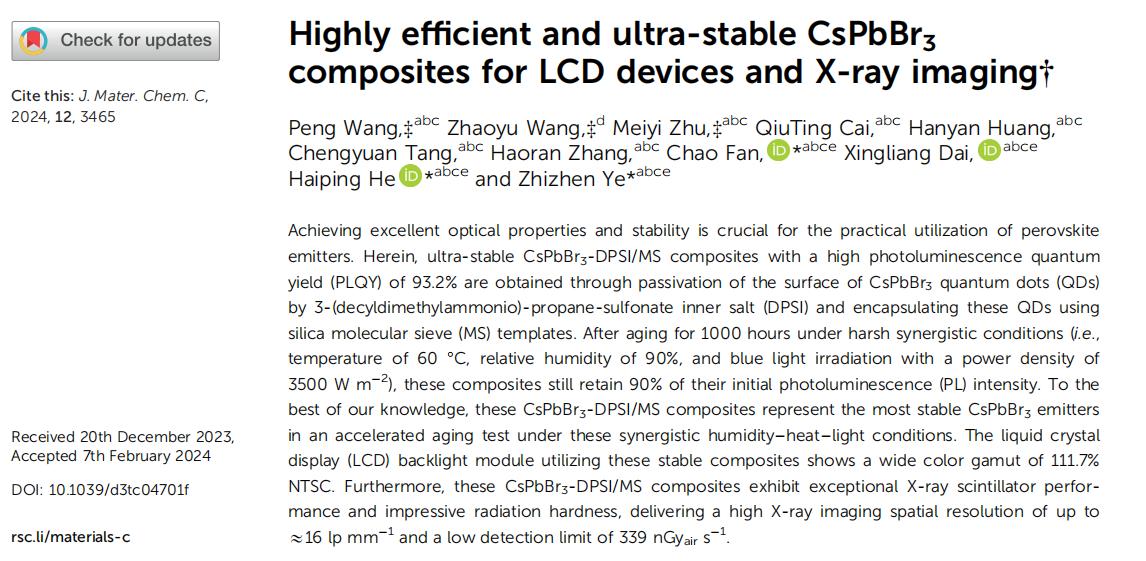 近日,浙江大学材料学院叶志镇院士团队在高光效、高稳定钙钛矿复合结构方面取得重要进展,研究成果以“Highly efficient and ultra-stable CsPbBr3 composites for LCD devices and X-ray imaging”为题发表在国际知名学术期刊Journal of Materials Chemistry C (doi:10.1039/d3tc04701f)上。浙江大学为该论文第一单位,王朋博士、王昭宇博士、朱美怡博士为共同第一作者,叶志镇院士、何海平教授、樊超博士为共同通讯作者。