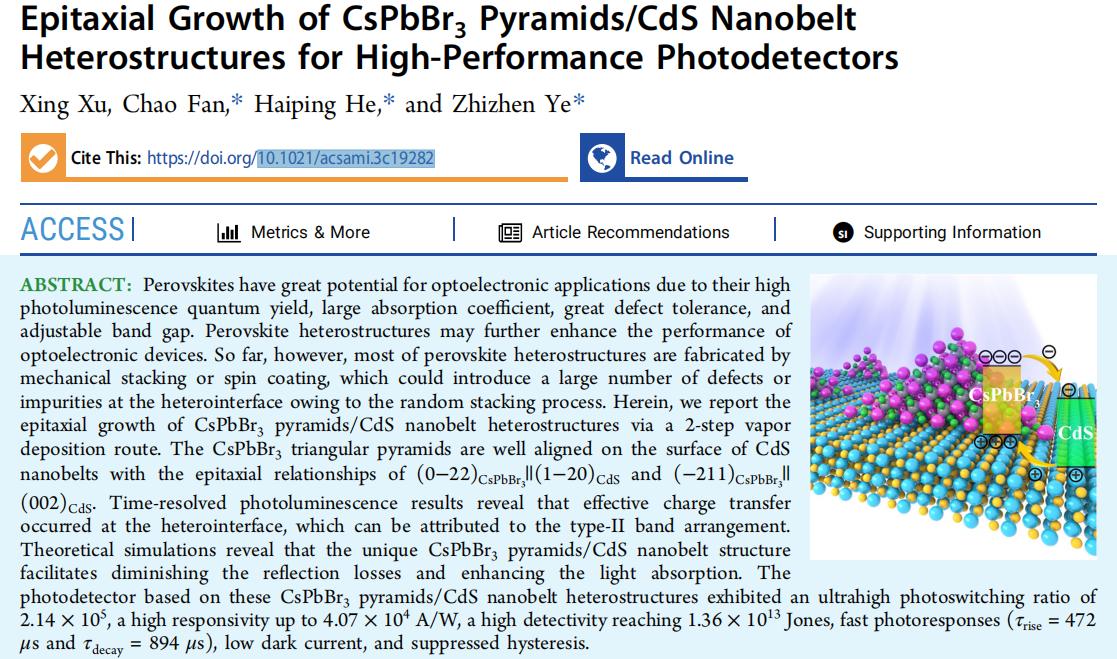 近日,浙江大学材料学院叶志镇院士团队在钙钛矿异质结构方面取得重要进展,研究成果以“Epitaxial Growth of CsPbBr3 Pyramids/CdS Nanobelt Heterostructures for High-Performance Photodetectors”为题发表在国际知名学术期刊ACS Applied Materials&Interfaces (doi:10.1021/acsami.3c19282)上。徐兴博士为第一作者,叶志镇院士、何海平教授、樊超博士为共同通讯作者。