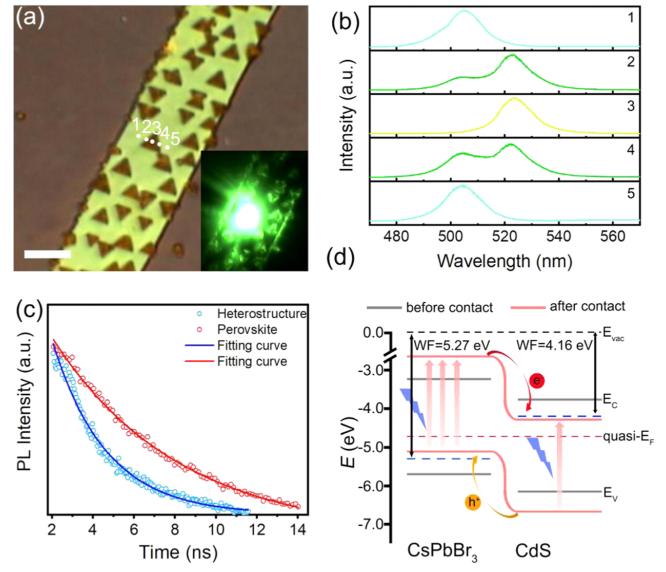 以上图中可见,CdS/CsPbBr3异质结在457nm光激发下发射出强烈的绿色荧光,即带边激子的辐射复合发光。在异质结界面上收集的光谱(2和4)显示了分别来自CdS和CsPbBr3的荧光峰,这也表明了高质量CdS纳米带/CsPbBr3金字塔异质结构的形成。时间分辨光谱进一步揭示了其荧光衰减过程,由于在CdS/CsPbBr3 异质结界面上发生了有效的电荷提取,使得异质结的荧光寿命仅为2.61ns,明显短于纯CsPbBr3的寿命。