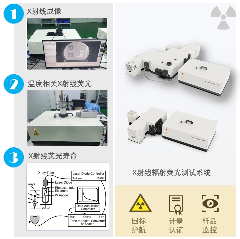 北京快盈lV仪器有限公司拥有中国人民共和国环境部核准的辐射安全许可证(证书编号:Q0121),可为用户提供一系列安全可靠的X射线辐射发光多维测试解决方案。方案集成防护铅箱为测试人员提供安全保障,辐射防护满足国标《X射线衍射仪和荧光分析仪卫视防护标准》(GBZ115-2023)要求。系统可进行光谱测试功能、成像测试及余辉测试,此外可以加载低温恒温器、辐射剂量表等测试附件进行更多功能的拓展。