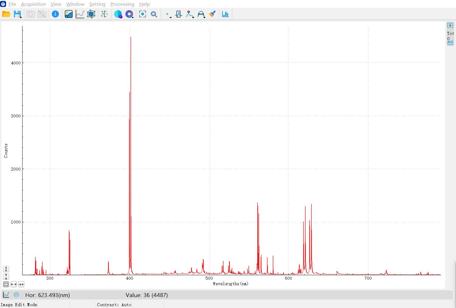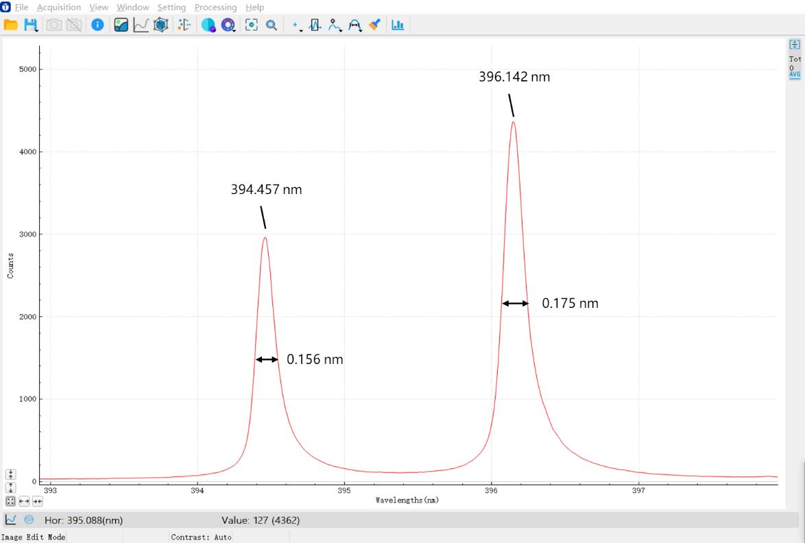 通过标准汞灯和T-Lab ViewIS软件校准后,光谱仪扫描拼接谱的光谱准确度能做到 < 0.2 nm(图3)。测试获得了铝合金LIBS光谱,如图4所示,Al元素特征谱线信号明显,谱峰位置偏移量小,谱线轮廓清晰。通过T-Lab ViewIS软件不同中心波长扫描多次成谱,可以生成大范围LIBS光谱(图5)。