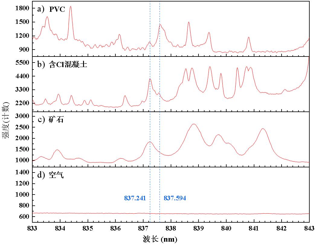 图7 PVC(聚氯乙烯)、含Cl混凝土、矿石和空气的LIBS光谱