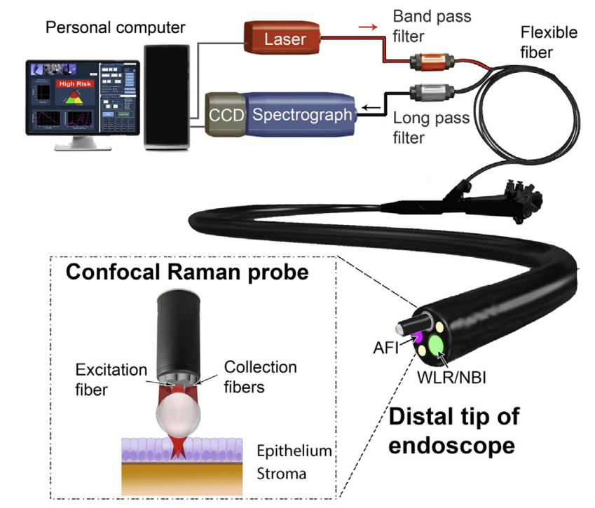 案例1:巴雷特食管是食管腺癌的前兆,早期识别异型增生等高危病变对于提高患者生存率至关重要。用于诊断BE异型增生的传统内窥镜检查受到诊断准确性差和需要大量活检取样的限制,导致高昂的医疗成本和患者负担。在新加坡进行的研究涉及从373名具有不同组织学亚型的上消化道患者身上获取体内组织拉曼光谱,从而构建了一个用于诊断BE异型增生的综合拉曼库,该系统允许在内窥镜检查期间进行实时、无创或微创光学活检,以更高的精度针对高风险组织区域[]。
