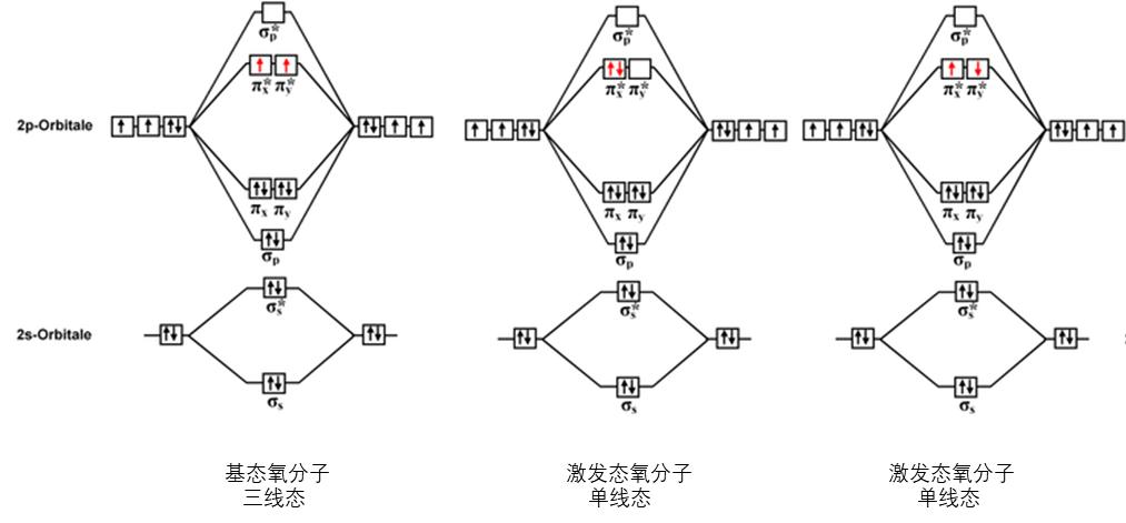 通常我们呼吸的氧气分子性质稳定,属于三线态氧分子3O2,如果我们从微观角度去看,氧气分子中两个自旋平行的电子分别占据两个2pπ*轨道,自旋多重性为3,称为三线态。当基态氧原子被激发后,原本两个2pπ*轨道中两个自旋平行的电子,既可以自旋相反地同时占据一个2pπ*轨道,也可以分别占据两个2pπ*轨道。这两种分子激发态下的自旋多重性均为1,也就是接下来要介绍的单线态氧分子1O2。