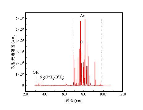 利用等离子体光谱诊断技术可以观察到激发态物种的光谱强度、活性物种的相对分布、震动温度以及转动温度等关键参数。这些参数反映了等离子体内部物理和化学过程的动态平衡,在等离子体电子输运过程及化学反应过程中发挥着重要作用[2],也为优化等离子体技术、提高应用效果提供了重要理论指导。