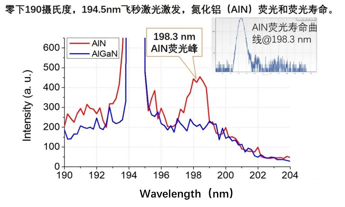 图1 红线和蓝线分别是在 -190℃ 的温度下在同一样品台上和同等条件下AlN样品和作为对比样品的Al0.7Ga0.3N的深紫外光致发光谱。内插图为AlN在198.3 nm发光峰的荧光寿命曲线。