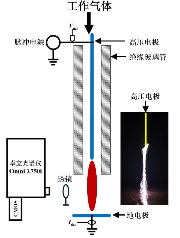 大气压低温等离子体射流实验装置由高压脉冲电源、等离子体射流发生器、卓立发射光谱测量系统、电参数测量系统和供气系统构成,如图1所示。高压电极放置在单端封口的石英玻璃管中,其底端距离地电极20mm。高压脉冲电压峰值14kV,频率2kHz,脉宽500ns。工作气体为氩气,流速2.5L/min。卓立发射光谱测量系统由卓立Omni-λ750i光谱仪与科学级像增强型相机IsCMOS构成,IsCMOS相机也可单独连接镜头做像增强高速相机使用,如图2所示。