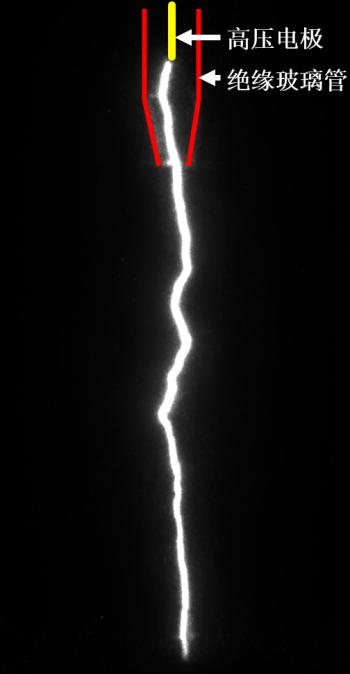 利用IsCMOS拍摄的单个脉冲放电照片如图3所示。设置相机曝光时间为500ms,关闭IOC,单次触发采集。利用信号发生器外触发相机,频率2kHz,与高压脉冲电源同步。门延时(delay)设置180ns,门宽(width)设置550ns。由图3可以发现,氩气射流放电在一个电压周期中呈现丝状,类似电弧的放电通道。