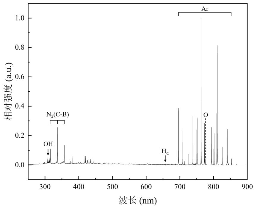 图5展示了Ar等离子体射流在250nm-900nm范围内的发射光谱。测量过程中利用凸透镜将等离子体的发射光汇聚进入光谱仪入射狭缝,狭缝宽度50μm,光栅刻度1200g/cm。从发射光谱中可以明显观察到N2、OH、O原子、Ar等粒子的发射谱线。