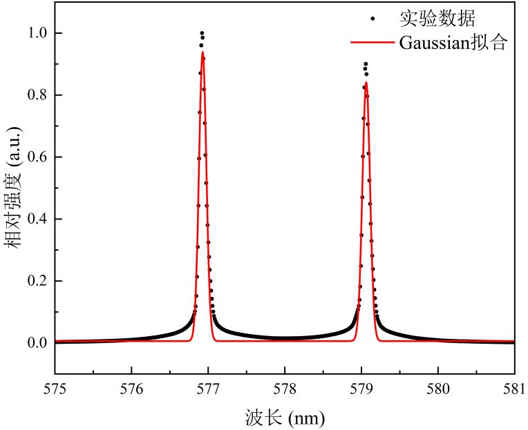 仪器展宽(ΔλI)测量拟合光谱如图6所示。在实验条件下测定低压汞灯在577nm与579nm处的特征谱线,经过Gaussian拟合,得到仪器展宽ΔλI=0.1150nm。