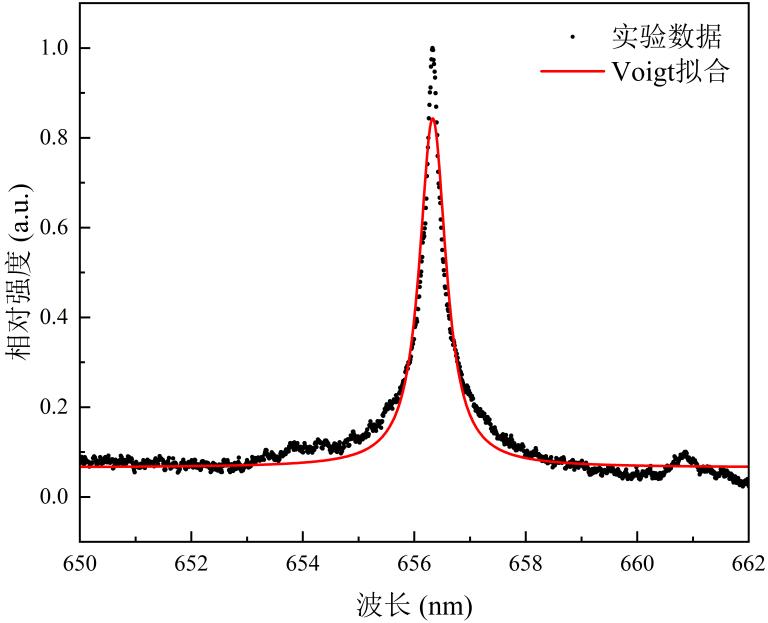 图8给出了Ar等离子体射流在650nm-662nm范围内的Hα谱线,以及进行Voigt拟合的结果,可以得出洛伦兹展宽ΔλL=0.5500nm。减去范德瓦尔斯展宽ΔλW=0.0353nm,得到斯塔克展宽ΔλS=0.5147nm。根据式(5)计算得到,实验中使用的Ar等离子体射流的电子密度约为3.28×1016 cm-3。