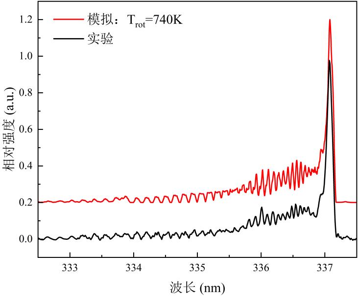 图7:Ar等离子体射流N2(C3Πμ-B3Πg)(Δν=0)实验与模拟光谱