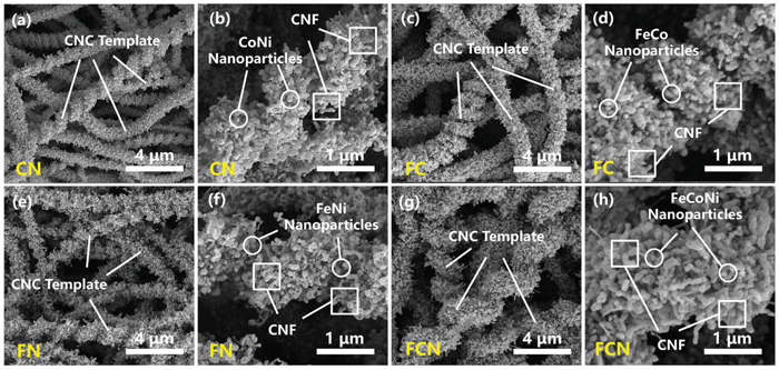 图二: CN, FC, FN, FCN复合材料的SEM图像。