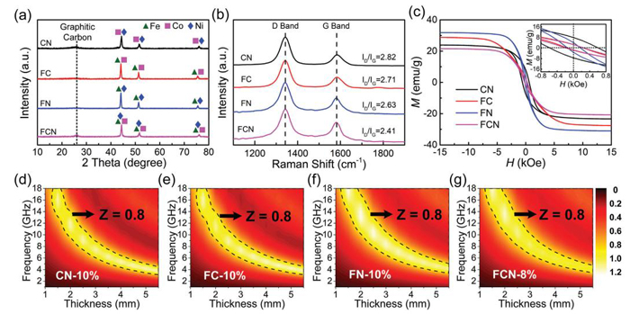 图四:a) XRD谱图,b)拉曼光谱,c) CN、FC、FN和FCN复合材料的室温磁滞回线;d) CN, e) FC, f) FN, g) FCN复合材料阻抗匹配等值线图。