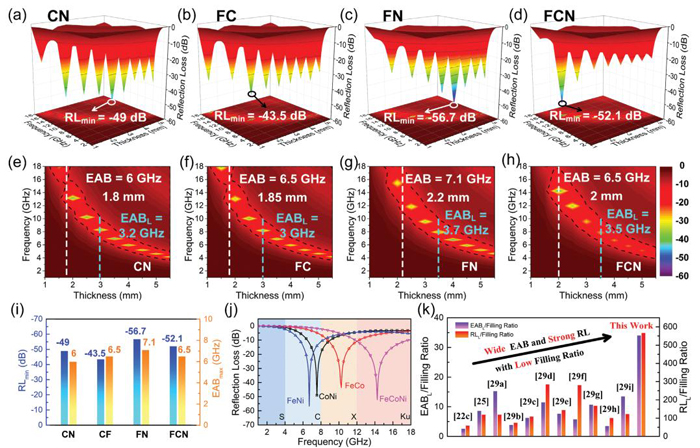 图五:a、e) CN, b、f) FC, c、g) FN, d、h) FCN复合材料的三维RL值及其投影图;i) CN、FC、FN和FCN复合材料的*小RL值和*大EAB值;j) CN、FC、FN、FCN复合材料的*小RL曲线;k)*小RLL/填充比和*大EABL/填充比与*近文献报道的其他碳/磁基吸收剂的比较。