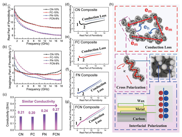 图六:a)介电常数实部,b)介电常数虚部,c) CN、FC、FN和FCN复合材料的电导率;d) CN, e) FC, f) FN, g) FCN复合材料的Cole-Cole图;H)样品介电损耗机理示意图。