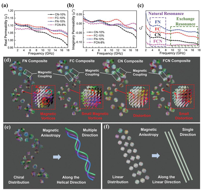 图七:a)磁导率实部,b)磁导率虚部,c) CN、FC、FN、FCN复合材料的涡流感应系数,d) CN、FC、FN和FCN复合材料的微磁模拟,e)手性分布模式和f)线性分布模式的微磁仿真。