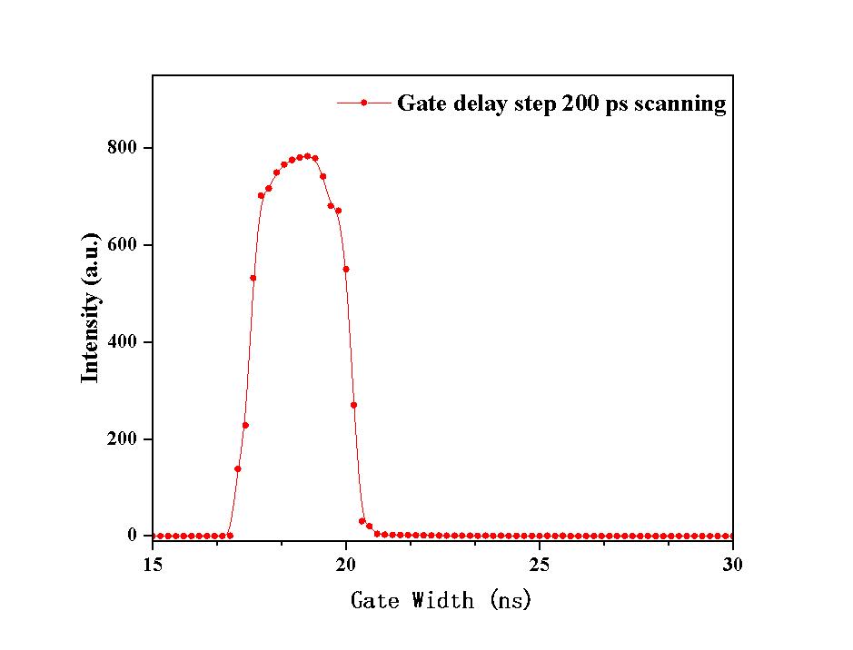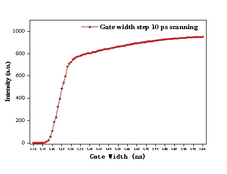 IsCMOS具有超快光学门宽,<3ns阴极光学门宽,内置精度<10ps门宽控制器。下图为门宽递进10ps扫描纳秒光源图谱。