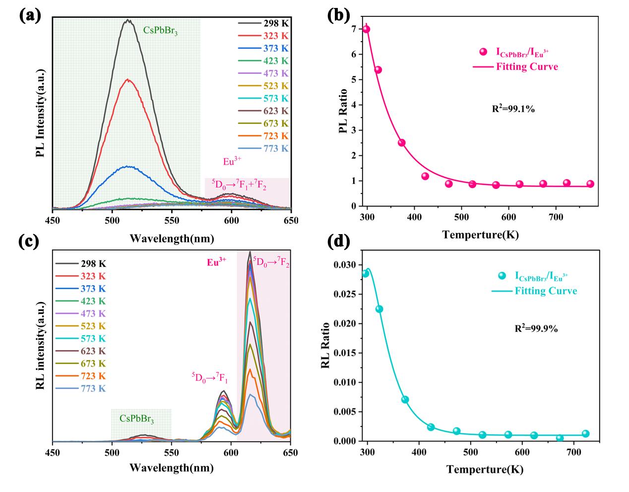 图1. CsPbBr3/Eu3+共掺杂样品的温度依赖性(a) PL和(c) XEL光谱以及(b) PL和(d) XEL对应的荧光强度比FIR(ICsPbBr3/IEu3+)指数拟合图。