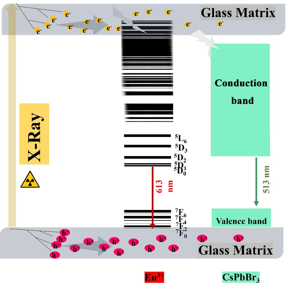 图2.CsPbBr3/Eu3+共掺杂玻璃的XEL机理示意图