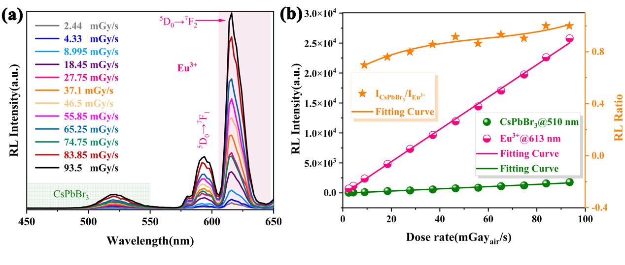 图3.(a) CsPbBr3/Eu3+共掺杂样品的X射线剂量率相关XEL谱;(b)双波段辐射强度随剂量率的变化。