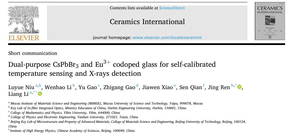 近日,澳门科技大学材料科学与工程研究院李良教授团队与哈尔滨工程大学任晶教授团队在自校准温度传感与X射线探测领域取得重要进展。研究成果以“Dual-purpose CsPbBr3 and Eu3+ codoped glass for self-calibrated temperature sensing and X-rays detection”为题发表在国际知名期刊《Ceramics International》上。澳门科技大学为该论文第一单位,李良教授/任晶教授为共同通讯作者。今天小卓为大家分享该研究成果,希望对您的科学研究或工业应用带来一些灵感和启发。