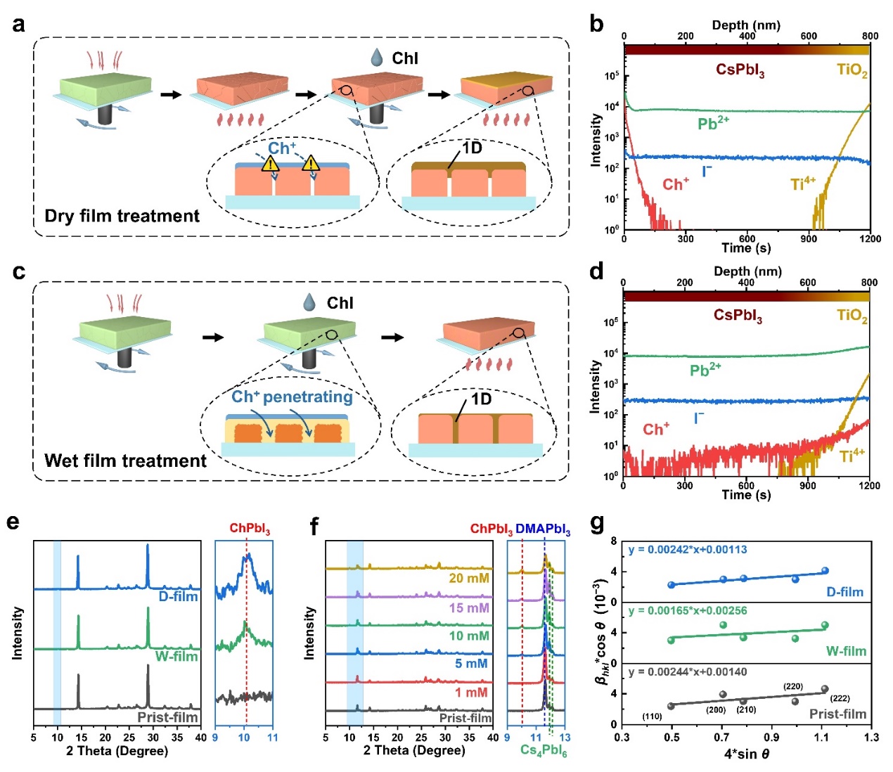 碘化胆碱(ChI)处理被证明可以有效钝化CsPbI3薄膜的表面缺陷,在退火后处理(干膜处理)过程中,ChI与CsPbI3通过离子交换反应形成1D ChPbI3,从而构建1D/3D异质结构。然而,由于Ch+的渗透性有限,Ch+很难穿透整个钙钛矿薄膜并在体相中形成LD钙钛矿。因此,传统的干膜处理不足以钝化CsPbI3薄膜中的体相缺陷。鉴于此,作者利用ChI对薄膜的中间相组成的湿膜进行处理,使ChI能够扩散到薄膜深处。由于ChI沿着中间相晶体的晶界渗透湿膜,生成的1D ChPbI3倾向于覆盖CsPbI3晶体。