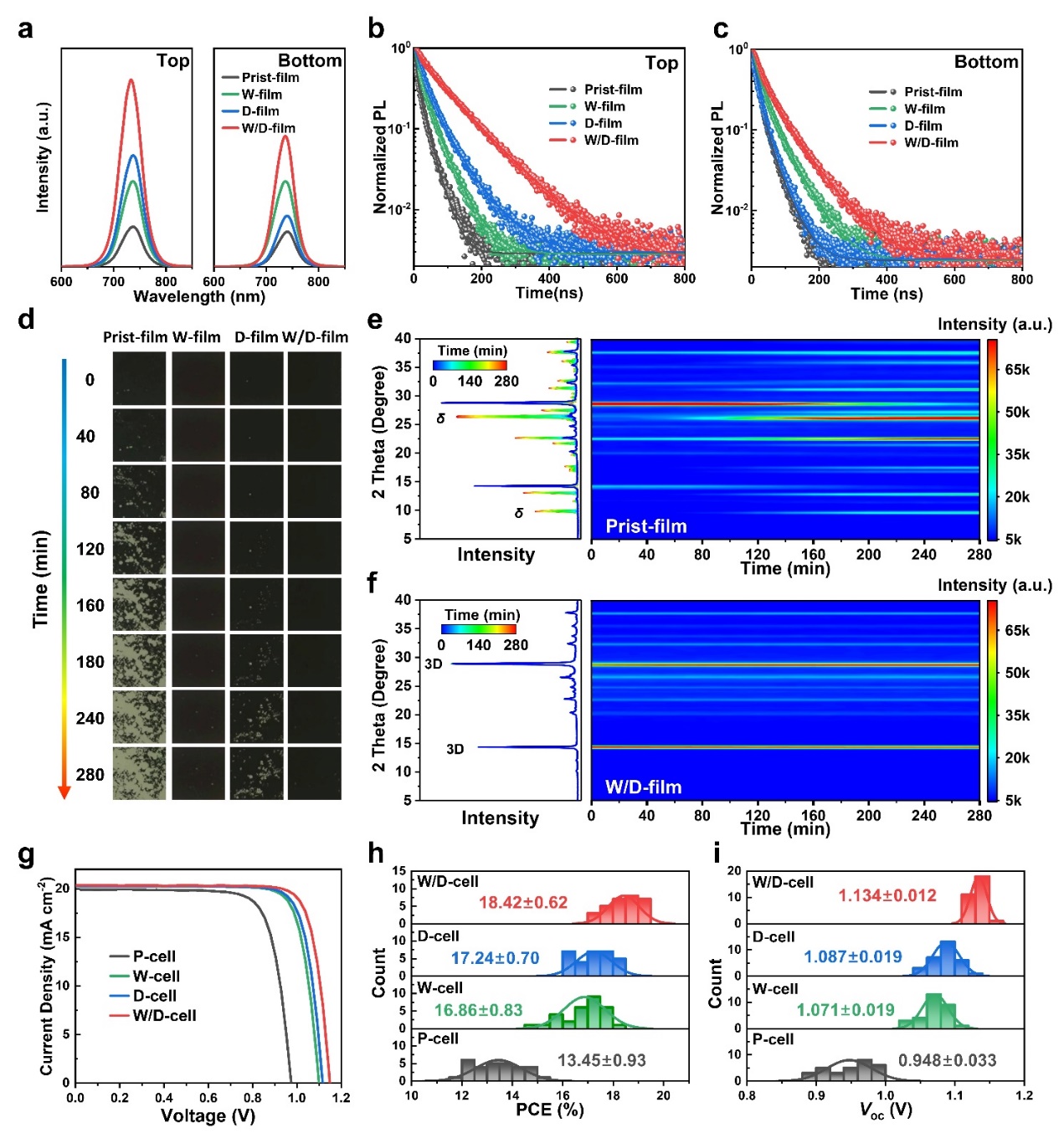 PL测试结果表明,干膜处理更有利于钝化钙钛矿薄膜的表面缺陷,而湿膜处理由于ChI的高渗透性更有利于钝化钙钛矿薄膜的体缺陷。为此,采用湿膜处理结合干膜处理的综合策略来获得W/D-film,以实现对CsPbI3薄膜表面和体缺陷的更有效的钝化。另外,湿膜处理过程中Ch+渗透到整个钙钛矿薄膜中并得到稳定的ChPbI3,抑制体相中δ相的形成,提高了钙钛矿相的稳定性。基于综合策略下组装的C-PSC获得了18.42%的冠军效率。