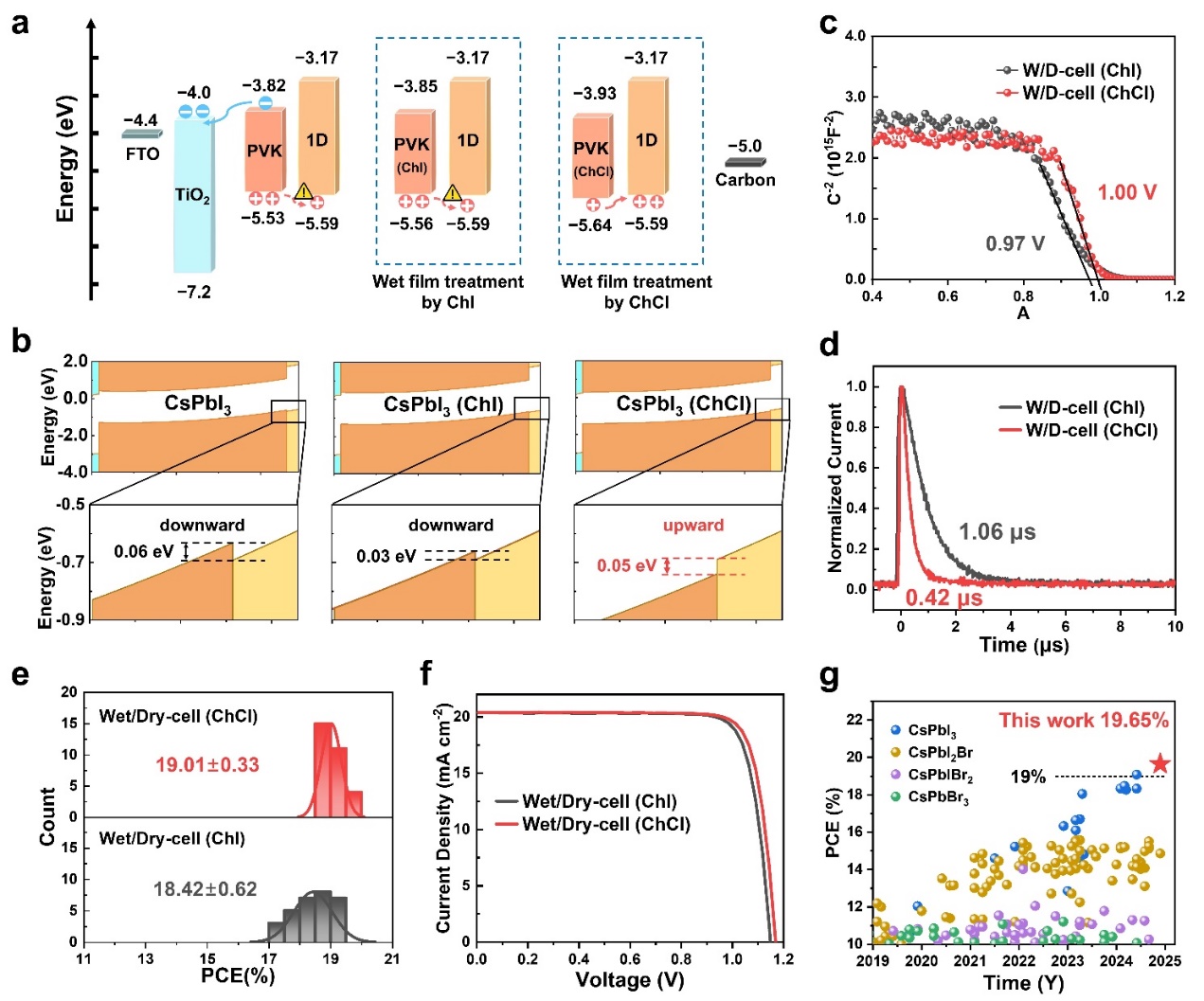 进一步的,作者发现,在湿膜处理过程中用ChCl代替ChI,能够将钙钛矿/碳界面从向下变为向上的能带弯曲,优化了能级结构,消除了空穴提取势垒,提高了载流子提取效率。*终获得的CsPbI3 C-PSC的效率达到 19.65%,创下了无机 C-PSC 的新纪录。