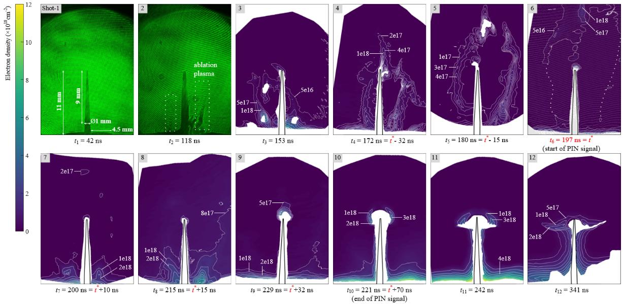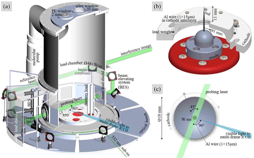 研究团队在西安交通大学汉-1脉冲功率装置上进行了实验,采用多种诊断手段对WS-RPD的等离子体动力学行为进行了深入分析。其中包括:激光干涉测量,用于观察等离子体电子密度分布;四分幅ICCD成像,捕捉等离子体可见光;电参数测量,包括Rogowski线圈测量电流及D-dot探头测量电压;X射线测量,采用PIN二极管探测X射线的辐射剂量率。