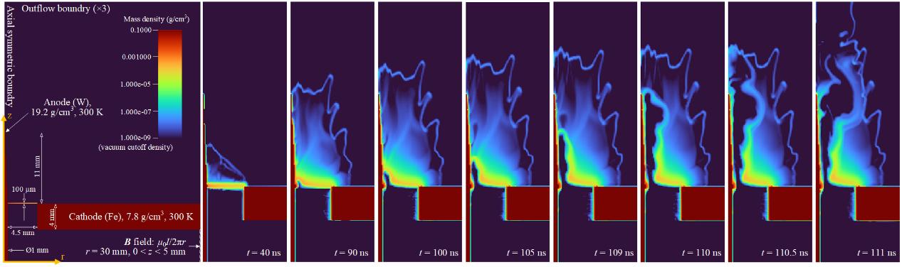 研究结果表明:EWE等离子体的运动可分为三个阶段:(1)初始阶段,金属丝爆炸产生等离子体,冷密的丝芯主体质量与电流路径保持静止;(2)运动阶段,部分等离子体受磁压力作用向阳极杆尖端移动;(3)X射线辐射阶段:受等离子体不稳定影响,原电流路径耗散,电子在磁绝缘的阴阳极间隙中发射与加速,在阳极尖端聚焦,产生X射线辐射。此外,研究团队通过电路分析发现,二极管电压在X射线辐射前开始上升,这一阶段的电压主要来源于等离子体的高速运动及其电流回路扩张带来的电感的快速变化。随着原电流路径的耗散,二极管阻性电压形成强电场加速电子,*终产生高能X射线。同时,研究团队利用FLASH磁流体模拟进一步验证了实验发现。本研究首次系统性地揭示了WS-RPD的等离子体动力学过程,并为未来优化低阻抗RPD的X射线转换效率提供了实验数据和理论模型。