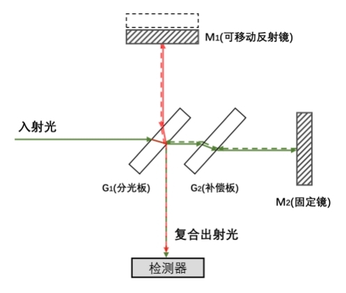拉曼散射光收集:散射光经过光学系统收集后,通过迈克尔逊干涉仪动态测定干涉图。透镜将入射光准直成一束平行光投射到分光板G1。随后拉曼散射光被分为两束,一束到达动镜M1,另一束经反射到达定镜M2。两束光分别经过定镜和动镜反射后再回到分光板上汇合后射出。复合出射光因存在光程差而发生干涉。显然,干涉图是光强度I(?)和光程差?的函数。动镜以恒定速度前后移动,因此干涉图也是光强度和时间的函数。