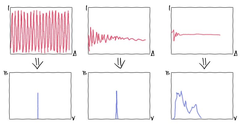 傅里叶变换:携带样品特征信息的干涉光被光电检测器转为电信号。这些信号先被分解为不同频率的成分,然后采用傅里叶变换算法进行解析,将时间域的干涉图转化为强度-频率函数关系,即频率域的光谱图(如下图所示)。该过程通过计算机代数完成。