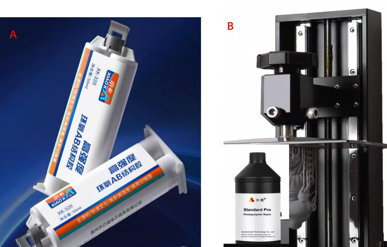 图2 待测样品:胺固化双酚A环氧树脂胶(A)和UV固化胶(B)